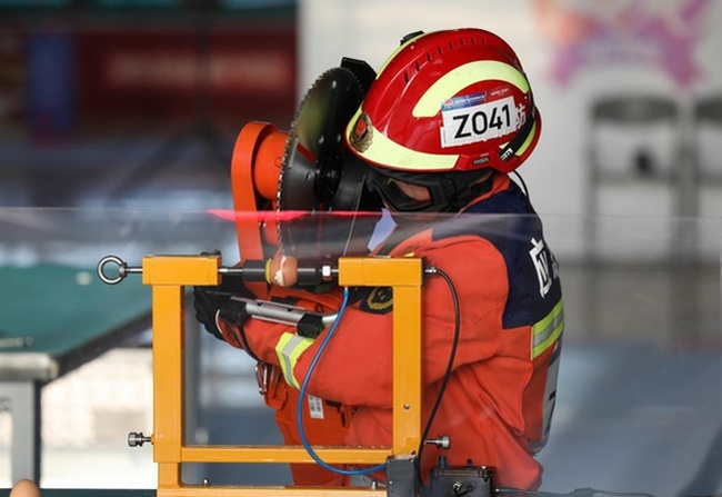 2021年10月28日,全國消防行業(yè)職業(yè)技能大賽決賽在南京舉行,參賽選手在比賽使用電鋸剝雞蛋殼。