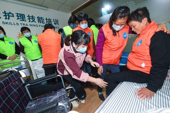 2021年10月21日,浙江省杭州市臨安區(qū)養(yǎng)老護理員培訓(xùn)基地的老師(前排右三)給養(yǎng)老護理員及黨員志愿者開展養(yǎng)老護理專業(yè)技能培訓(xùn)。